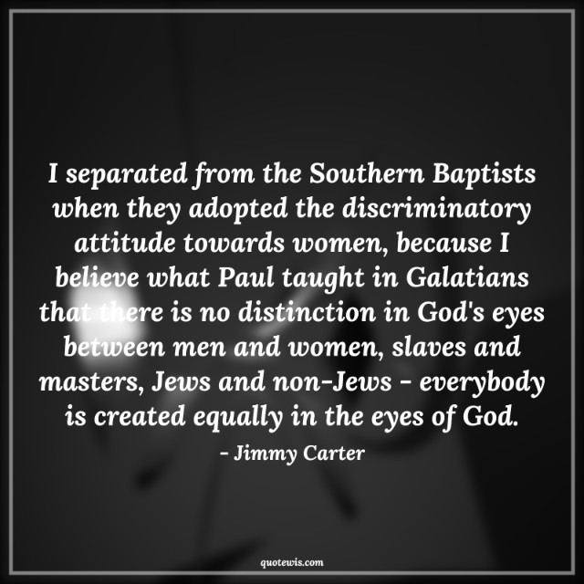 I separated from the Southern Baptists when they adopted the discriminatory attitude towards women, because I believe what Paul taught in Galatians that there is no distinction in God's eyes between men and women, slaves and masters, Jews and non-Jews - everybody is created equally in the eyes of God.
