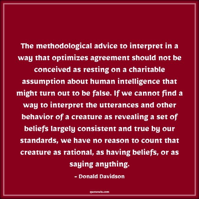 The methodological advice to interpret in a way that optimizes agreement should not be conceived as resting on a charitable assumption about human intelligence that might turn out to be false. If we cannot find a way to interpret the utterances and other behavior of a creature as revealing a set of beliefs largely consistent and true by our standards, we have no reason to count that creature as rational, as having beliefs, or as saying anything.