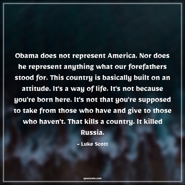 Obama does not represent America. Nor does he represent anything what our forefathers stood for. This country is basically built on an attitude. It's a way of life. It's not because you're born here. It's not that you're supposed to take from those who have and give to those who haven't. That kills a country. It killed Russia.