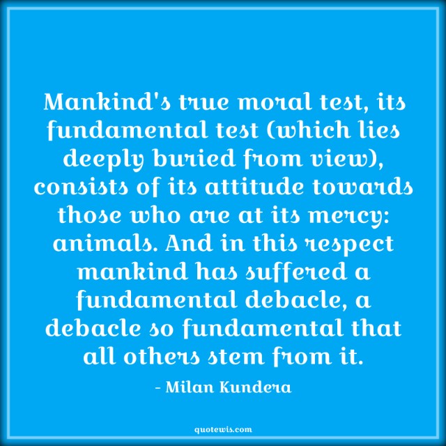 Mankind's true moral test, its fundamental test (which lies deeply buried from view), consists of its attitude towards those who are at its mercy: animals. And in this respect mankind has suffered a fundamental debacle, a debacle so fundamental that all others stem from it.