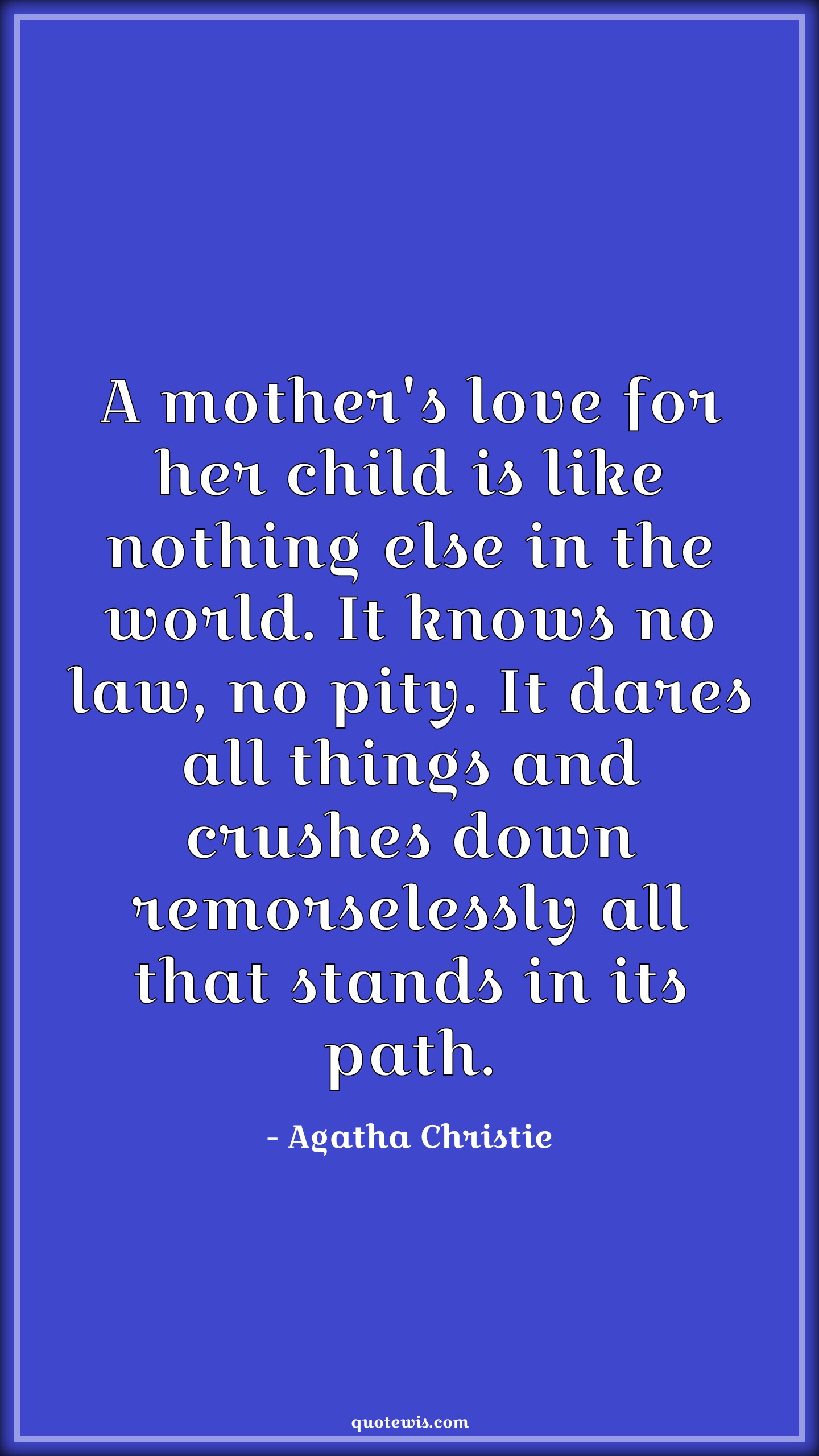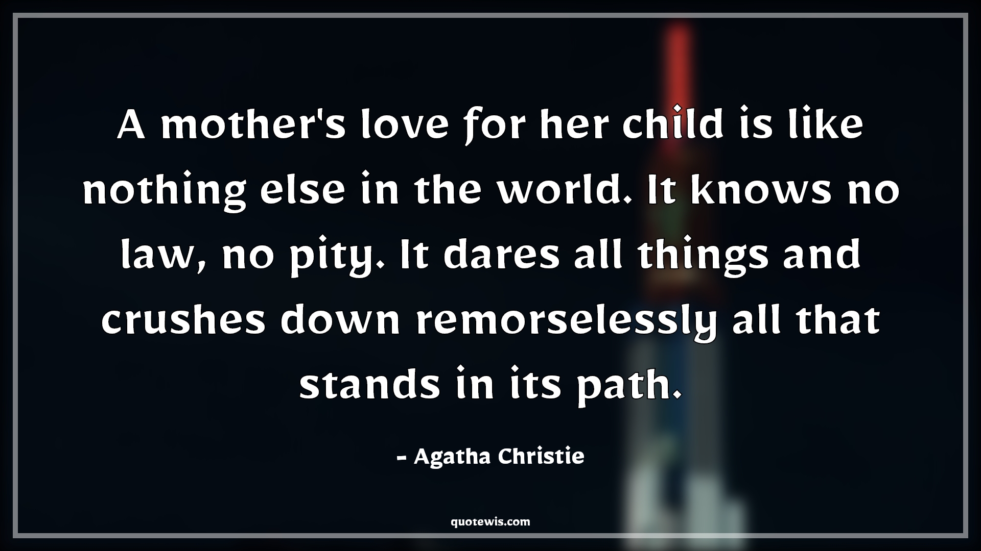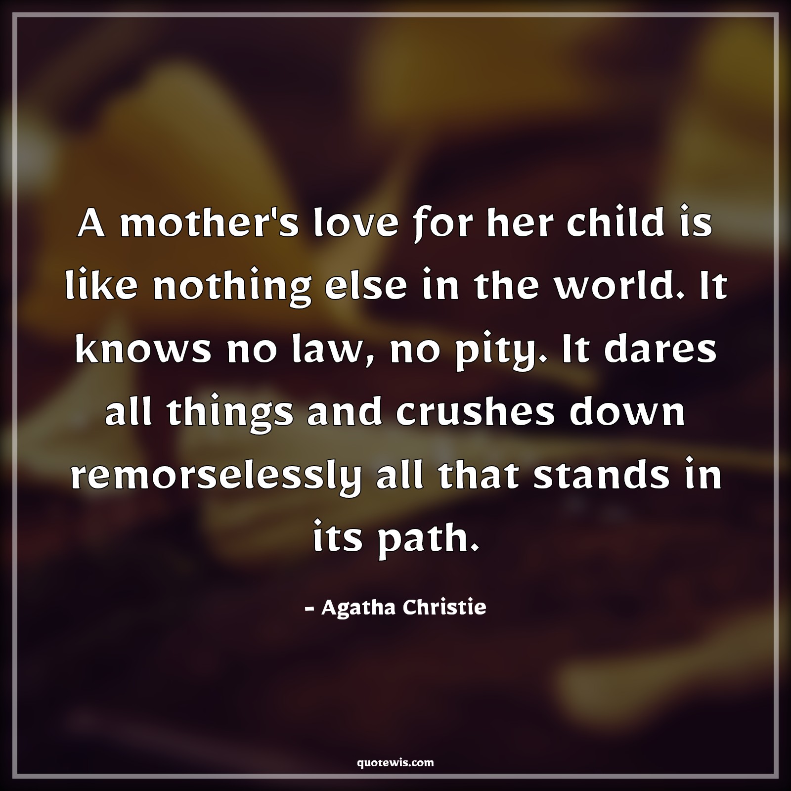 A mother's love for her child is like nothing else in the world. It knows no law, no pity. It dares all things and crushes down remorselessly all that stands in its path.