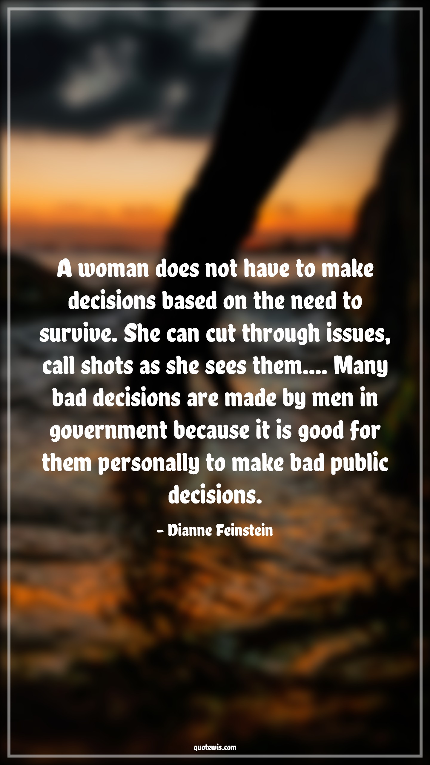 A woman does not have to make decisions based on the need to survive. She can cut through issues, call shots as she sees them.... Many bad decisions are made by men in government because it is good for them personally to make bad public decisions.