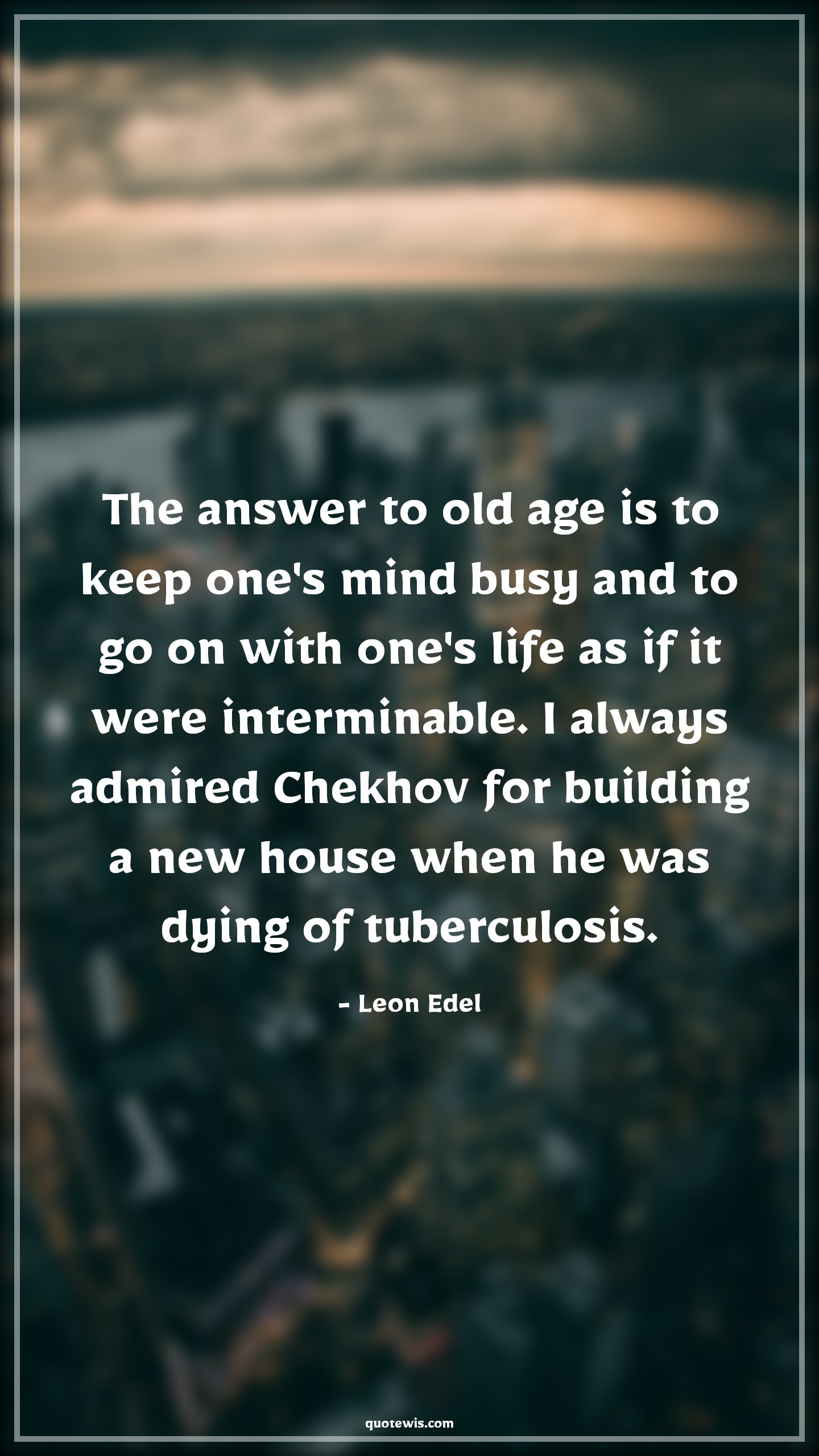 The answer to old age is to keep one's mind busy and to go on with one's life as if it were interminable. I always admired Chekhov for building a new house when he was dying of tuberculosis.