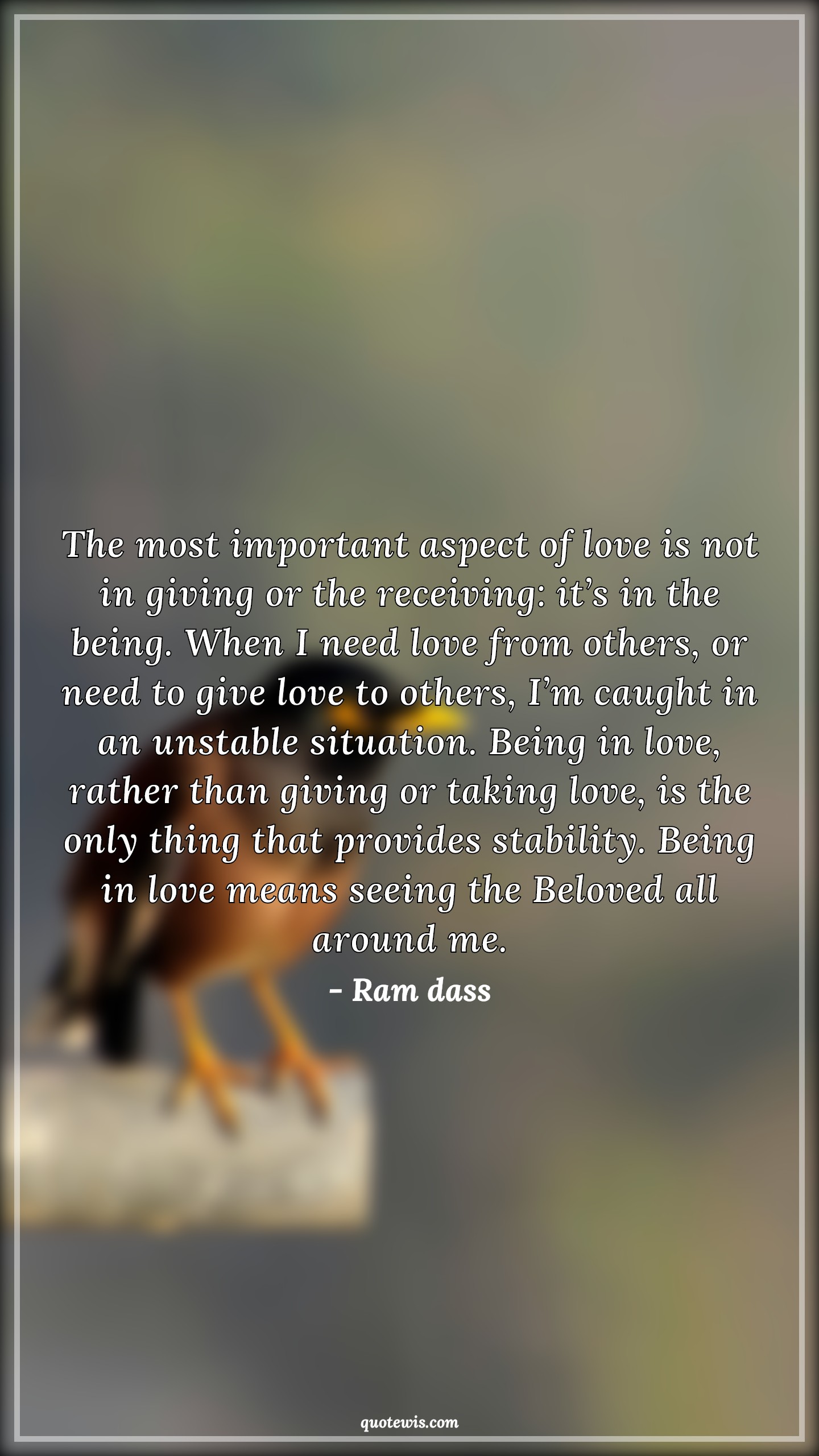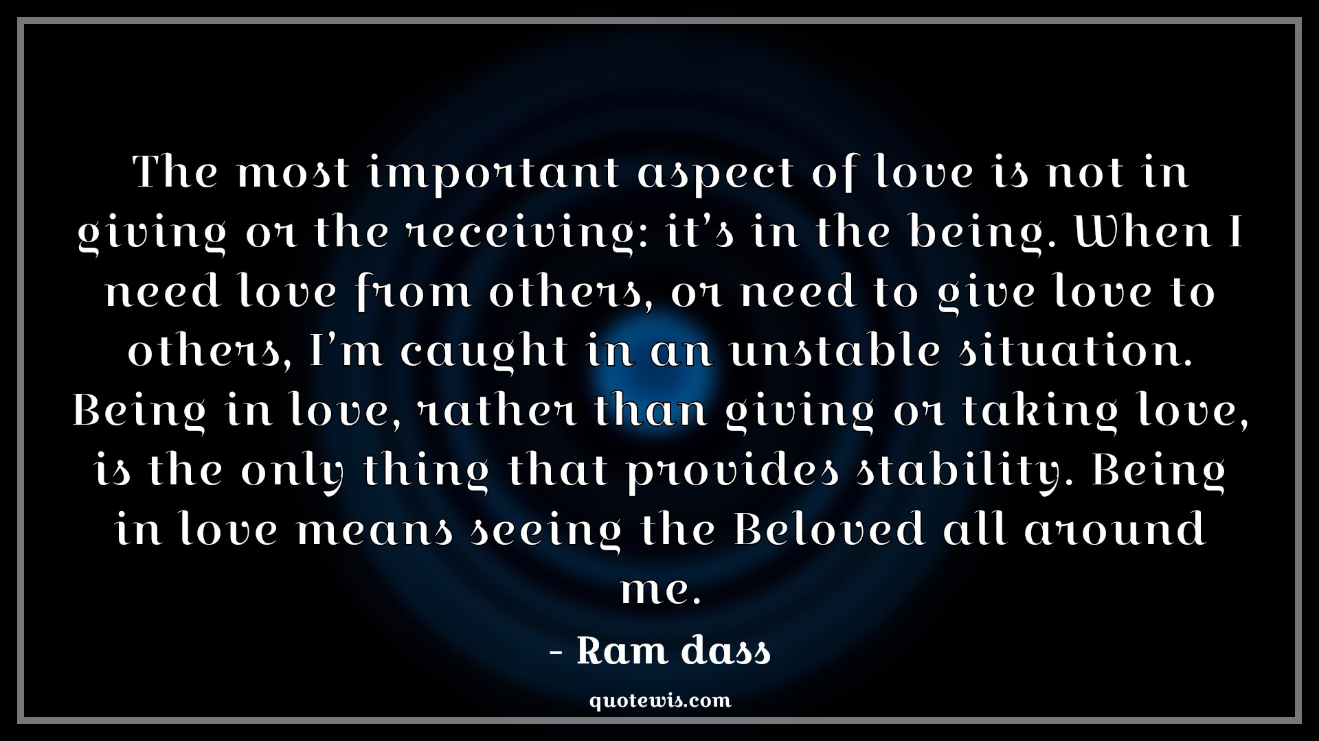 The most important aspect of love is not in giving or the receiving: it’s in the being. When I need love from others, or need to give love to others, I’m caught in an unstable situation. Being in love, rather than giving or taking love, is the only thing that provides stability. Being in love means seeing the Beloved all around me.