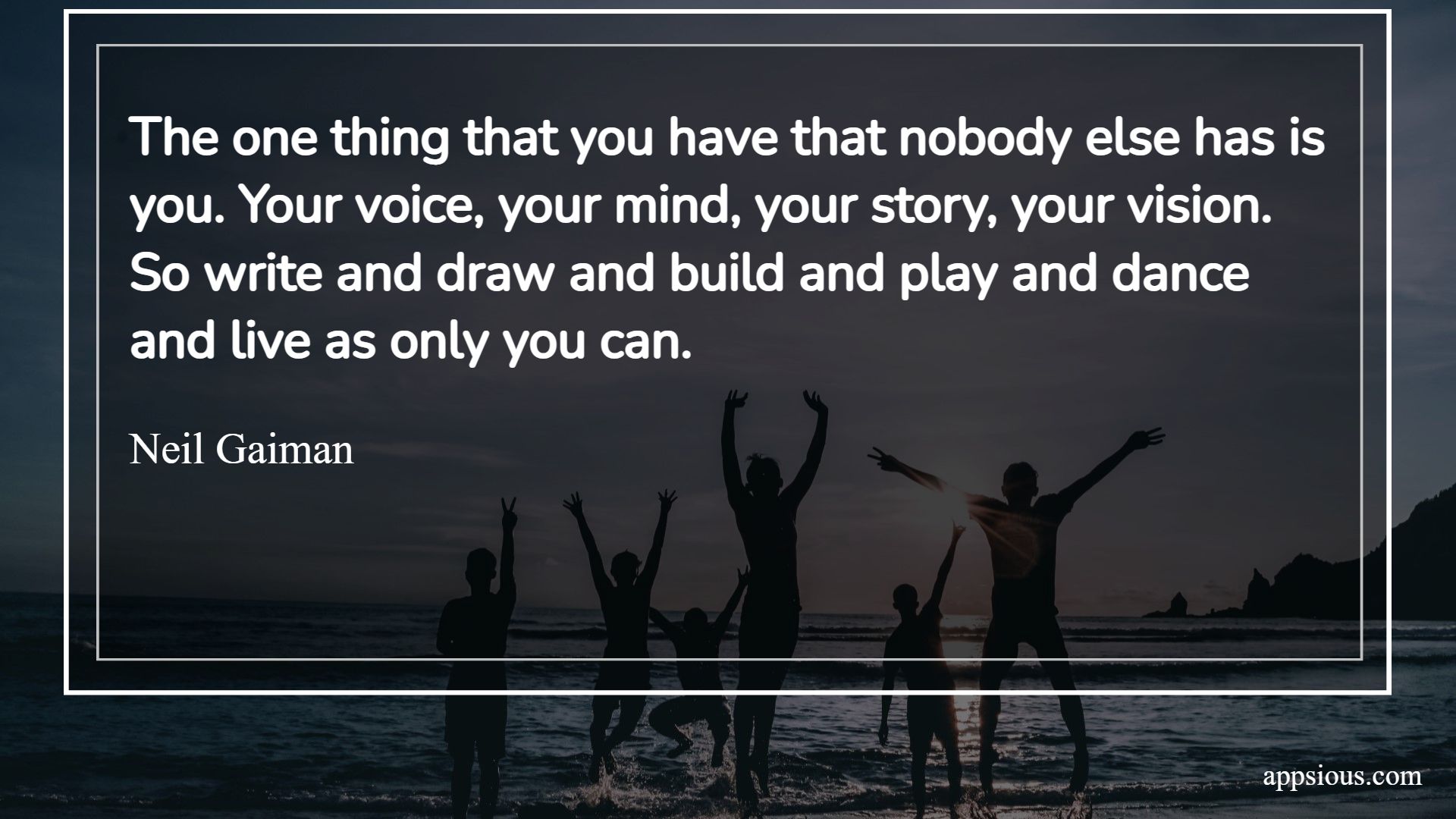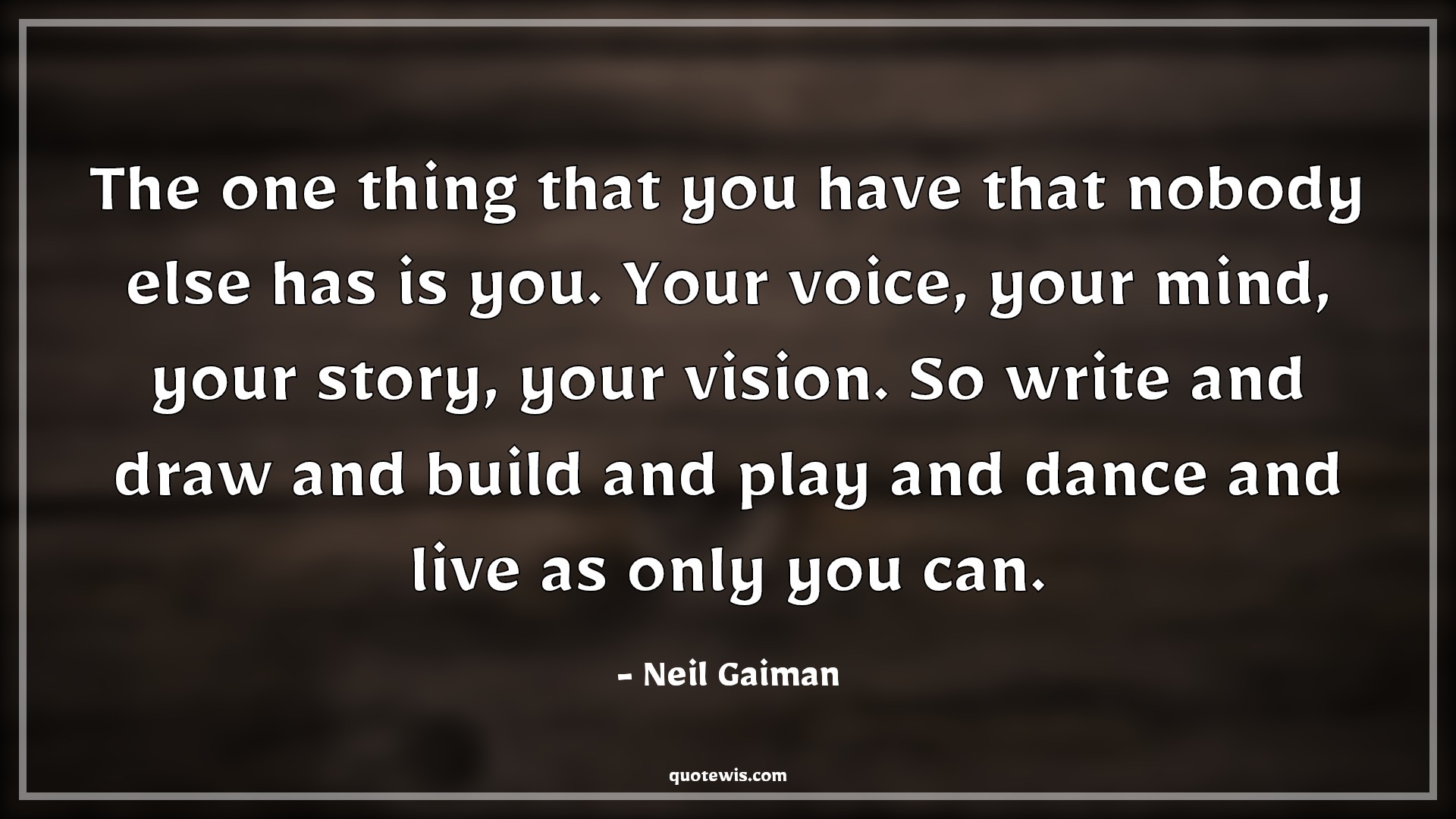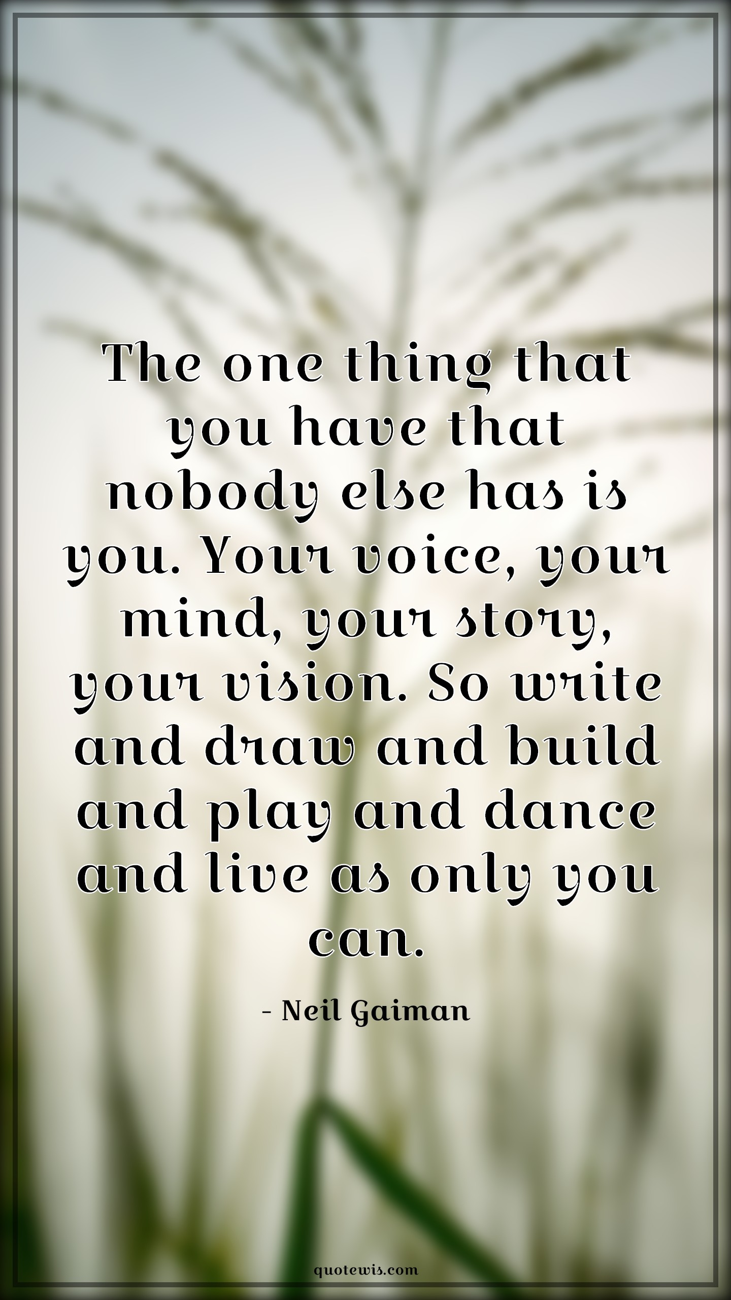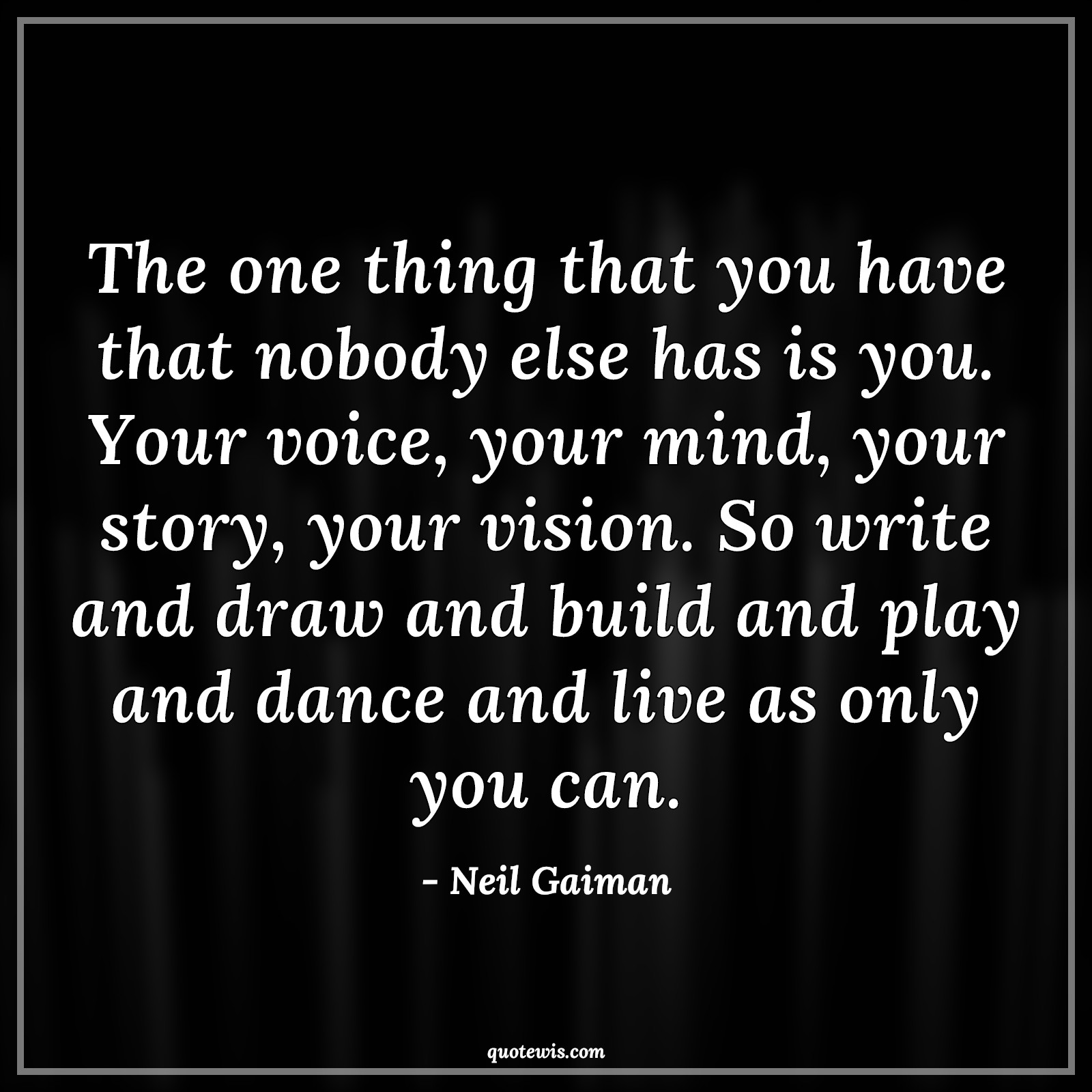The one thing that you have that nobody else has is you. Your voice, your mind, your story, your vision. So write and draw and build and play and dance and live as only you can.