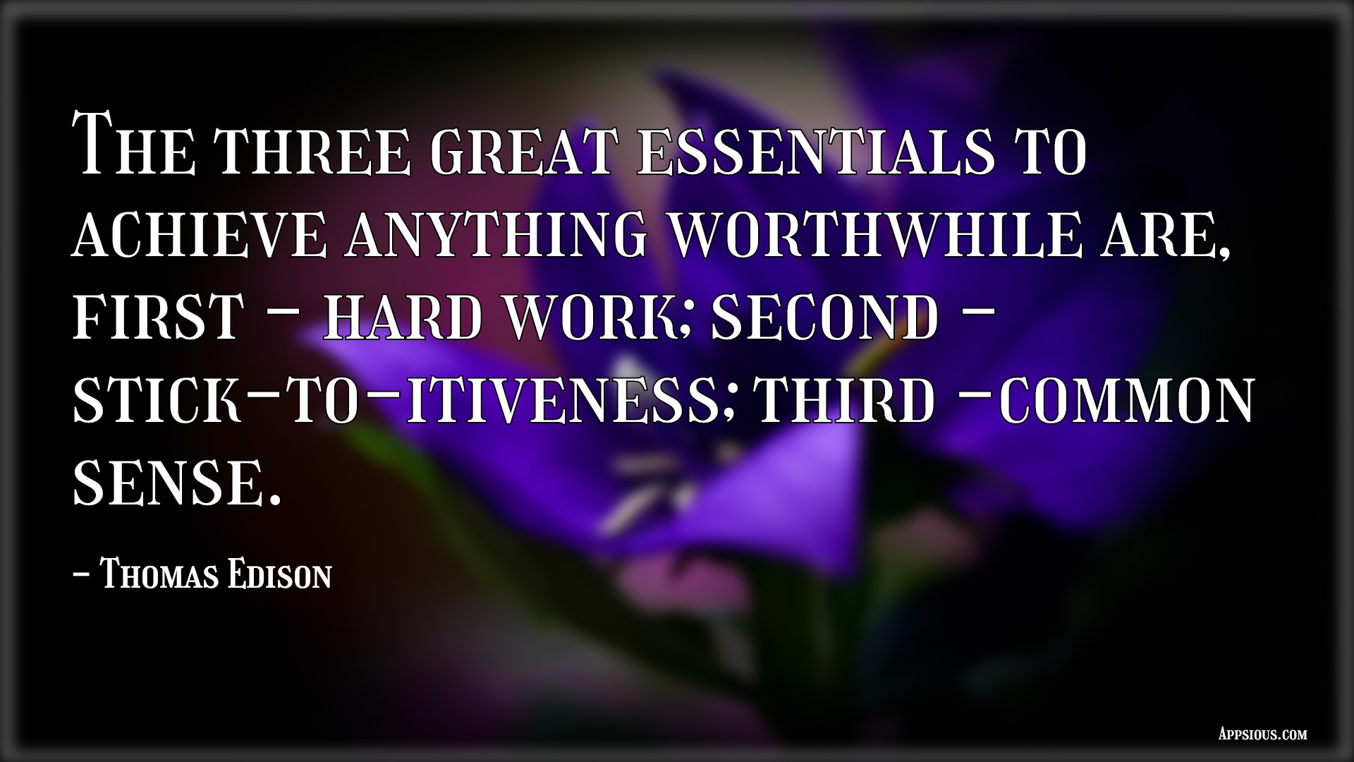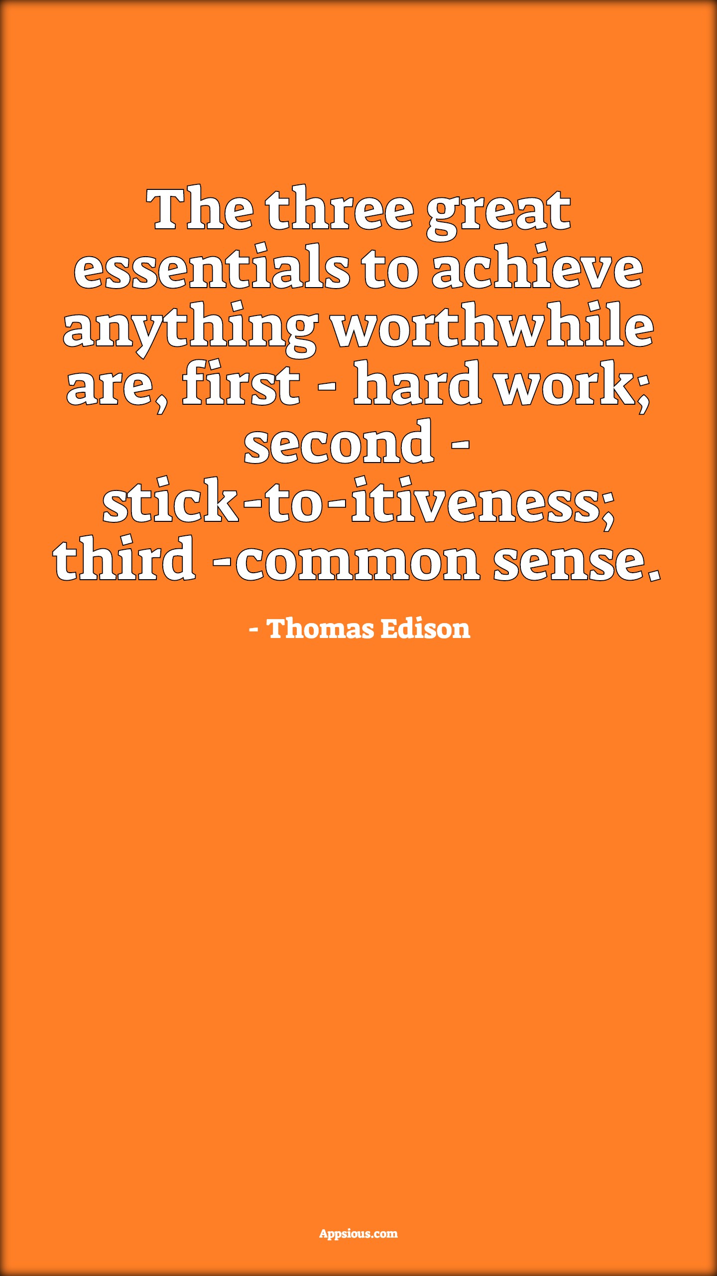 The three great essentials to achieve anything worthwhile are, first - hard work; second - stick-to-itiveness; third -common sense.