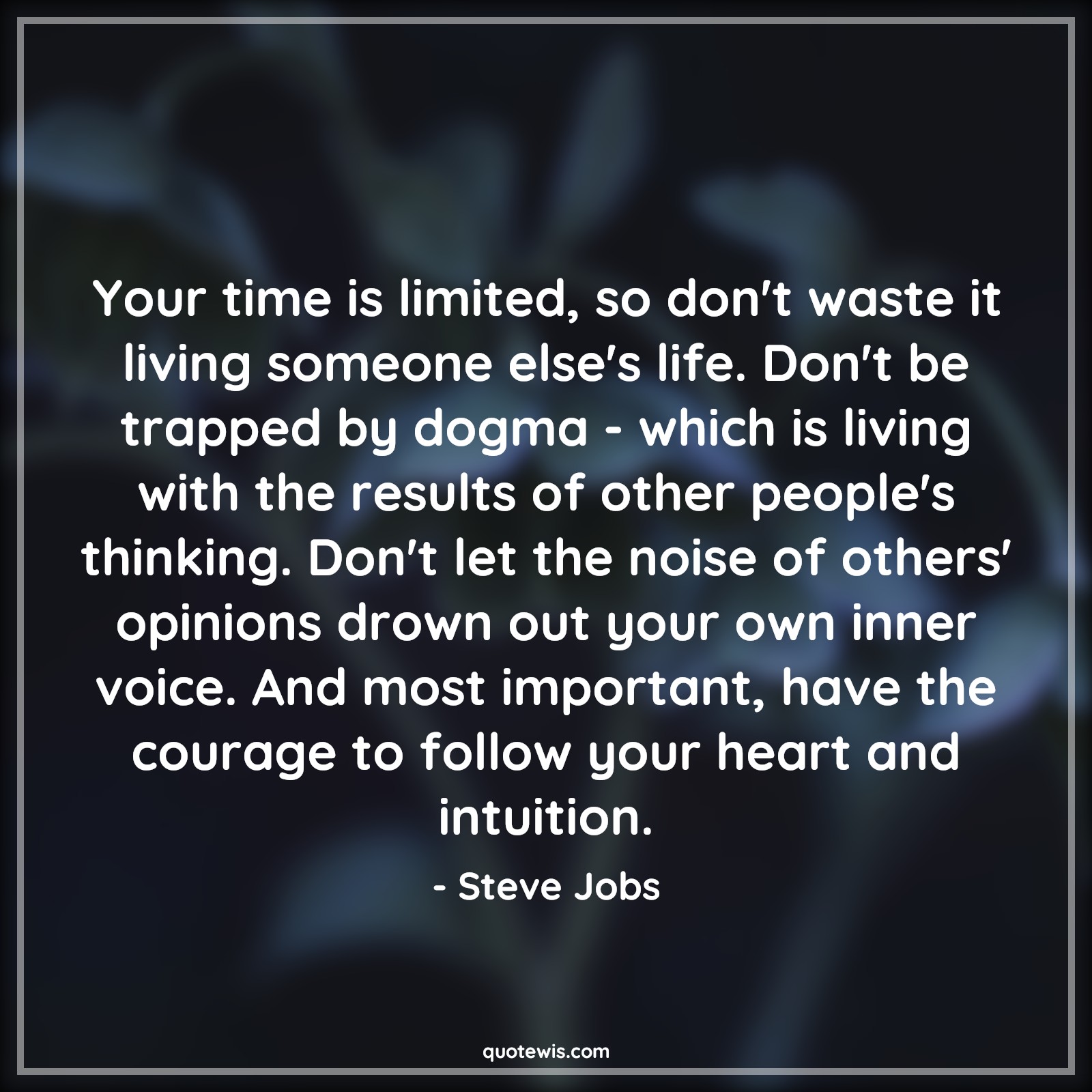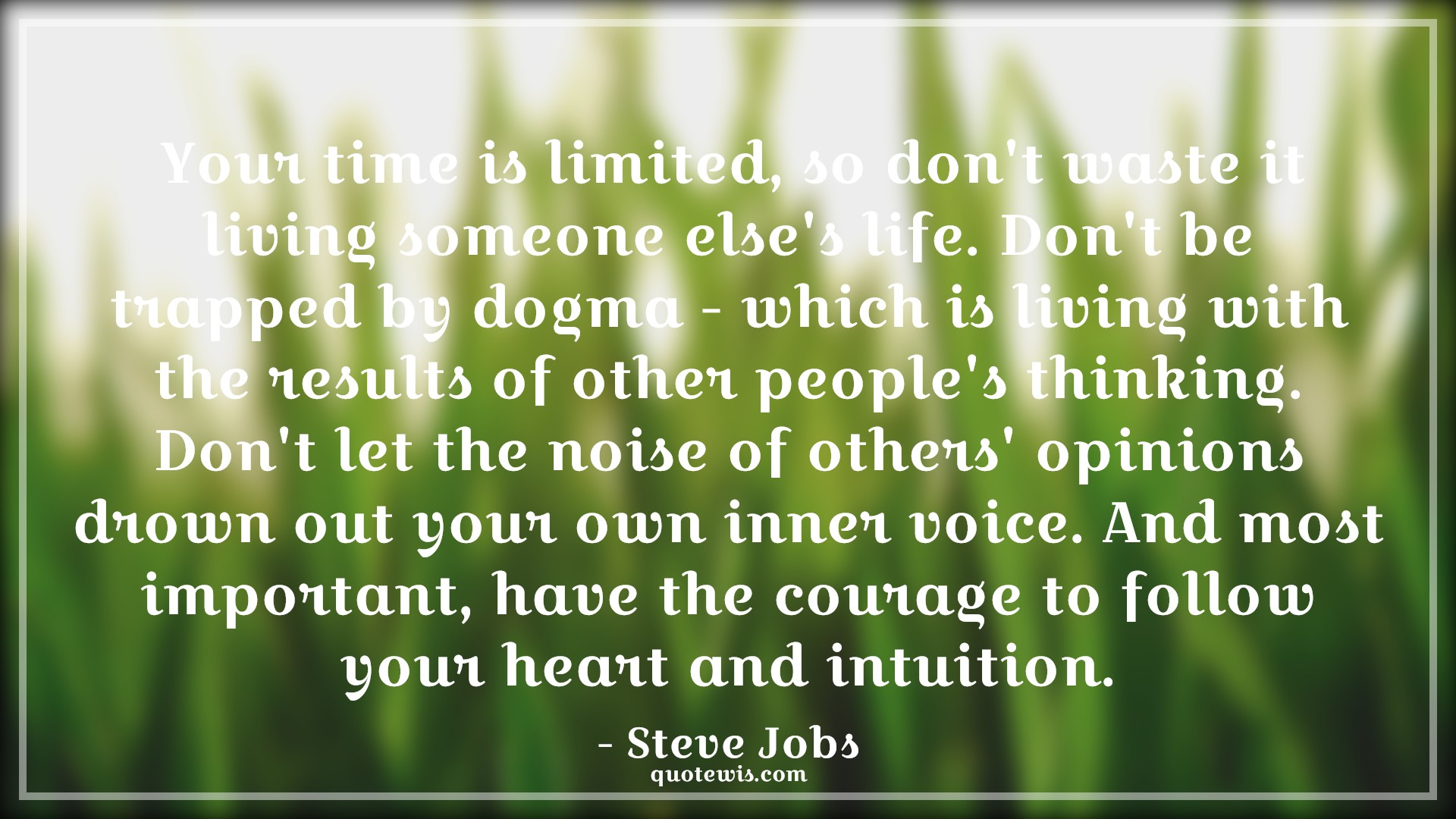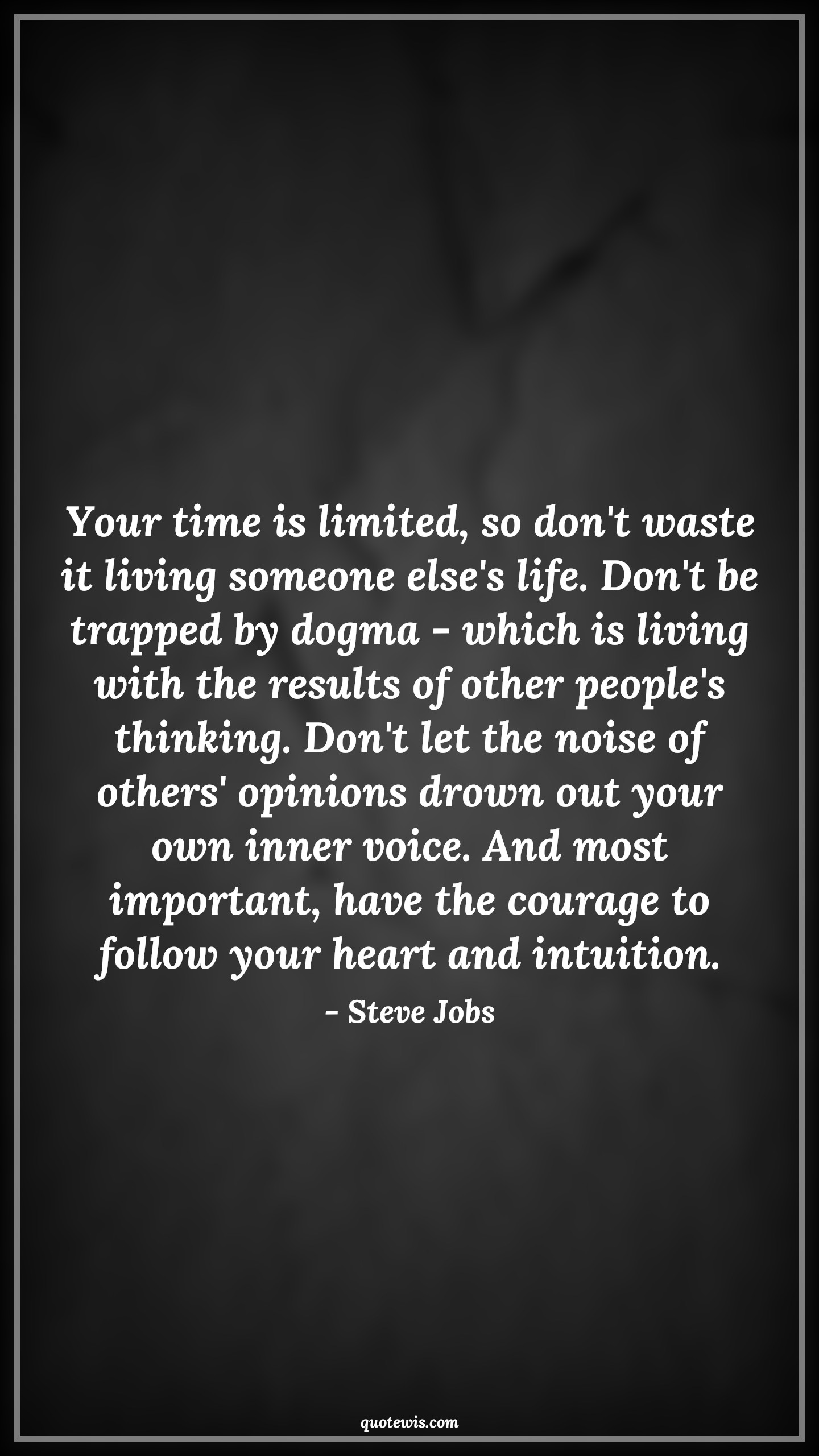 Your time is limited, so don't waste it living someone else's life. Don't be trapped by dogma - which is living with the results of other people's thinking. Don't let the noise of others' opinions drown out your own inner voice. And most important, have the courage to follow your heart and intuition.